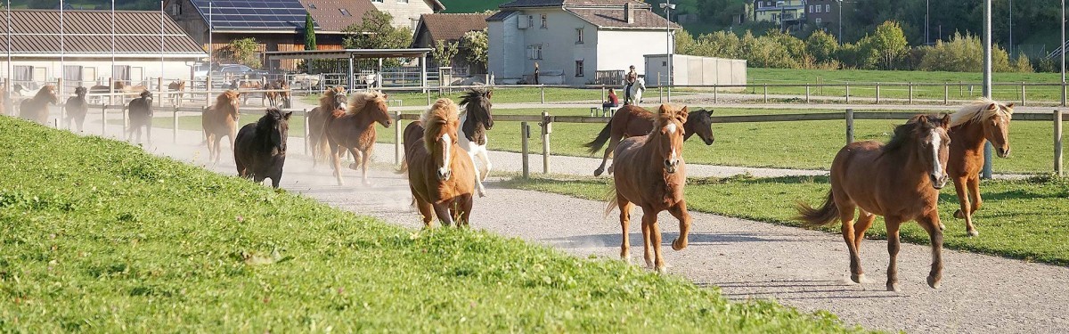 Unsere Pferde sind in grosszügigen Laufställen mit weitläufigem Auslauf untergebracht. Wenn sie sich nicht auf der Weide befinden, stehen ihnen verschiedene Aufenthaltsmöglichkeiten zur Verfügung: der Stall mit Fressständen, der befestigte Auslauf sowie offene Aussenboxen und geschützte Liegeplätze.