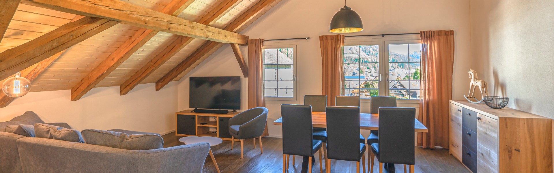 In unserer neu umgebauten Wohnung (3.5 Zimmer) im «Gestahús Neckertal» geniessen Sie Ihren Aufenthalt in vollen Zügen. Der Wohnbereich mit einer gemütlichen Couch und einem grosszügigen Tisch bildet das Zentrum der Wohnung.
